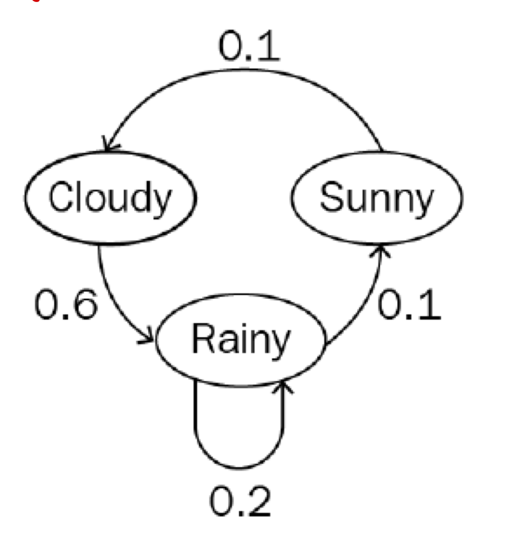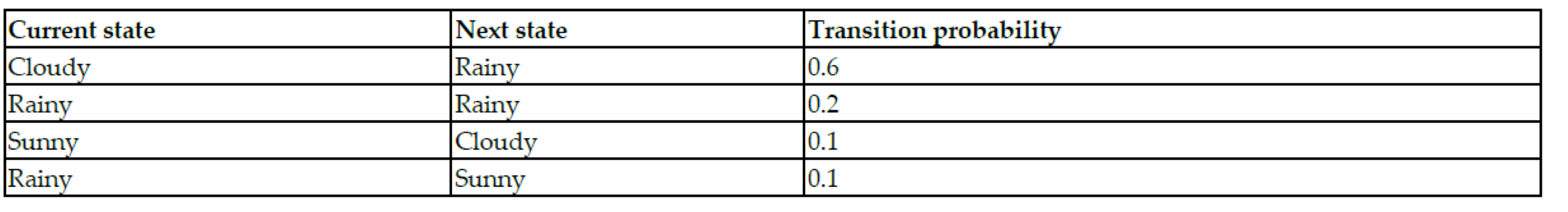 위 table에서, 현재 구름이 낀 상태(current state)일 때, 다음 상태(next state)가 비가 올 확률(transition probability)은 0.6이라는 것을 알 수 있다.