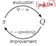 아래 그림과 같이 policy evaluation과 policy improvement가 서로 상호작용하는 과정, 즉 GPI(Generalized Policy Iteration)를 반복해주면 된다.