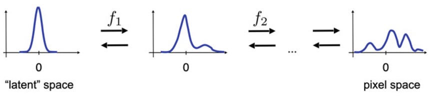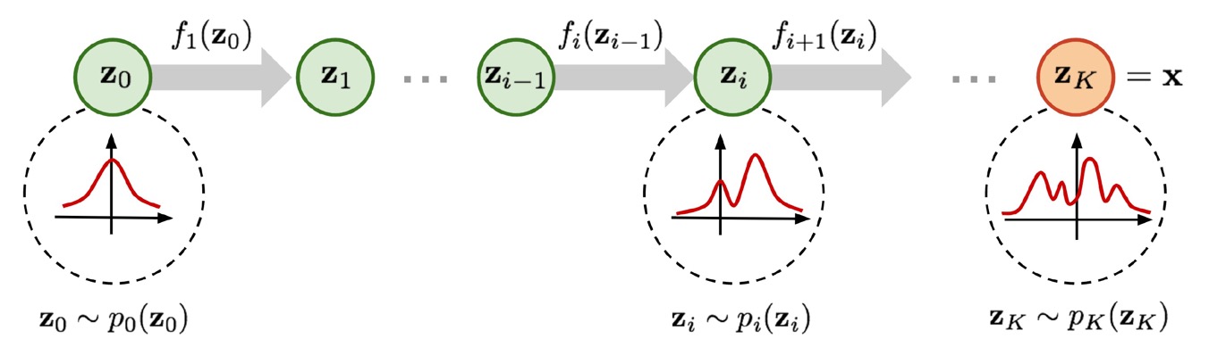 즉, Gaussian 등의 간단한 distribution으로 시작하여 \(K\)번의 invertible transformation을 거치는 것이다.