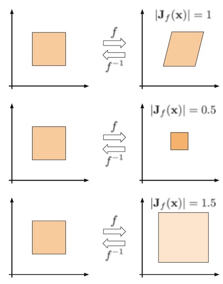 위쪽은 Jacobian의 determinant가 1임에 따라 volume이 보존된 bijection (volume-preserving bijection)을 나타내고, 가운데와 아래 그림은 Jacobian 값이 1보다 작은 경우 volume은 작아지지만 density가 커지고, 1보다 큰 경우에는 volume이 커지지만 density가 작아지는 경우를 나타낸다.