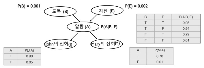 우선, 단순히 모든 relation을 고려할 경우(연결? or not?)에는 distribution을 정하기 위해 \(2^5 - 1\)개의 parameter가 필요할 것이다. 하지만, Bayesian network의 정의(conditional independent 성질)를 활용하여 그 개수를 줄여줄 수 있다.