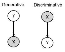 Generative model은 \(p(Y)\)와 \(p(\mathbf{X} | Y)\)를 둘 다 정의하고 학습한 후 Bayes rule을 통해 \(p(Y | \mathbf{X})\)를 계산해야 하지만, discriminative model은 conditional distribution \(p(Y | \mathbf{X})\)를 추정하기만 하면 된다. (p(\mathbf{X})\)는 주어졌으므로 모델링하거나, 학습하거나 사용할 필요가 없기 때문이다.