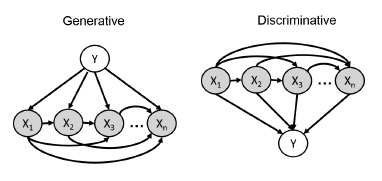 이전에 언급했듯, classification task에서 두 모델의 목적은 데이터 \(x\)와 class label \(y\)에 대해 posterior \(p(y|x)\)를 예측한다는 공통적인 목적을 갖고 있으나, 그 접근 방법이 다르다.