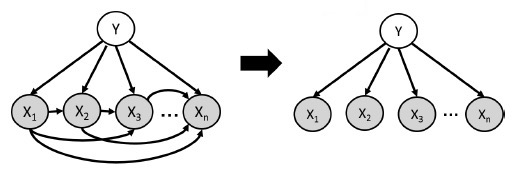 Naive Bayes classifier에서는 모든 데이터가 조건부 독립이라고 가정하면서 식을 단순화한다. (가정 : \(X_i \bot \mathbf{X}_{1:i-1} | Y\) )
