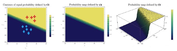 Fig 7 예시와 같이, discriminative classifier의 경우 decision boundary(예를 들어 \(p(Y=1 | \mathbf{x}; \boldsymbol{\alpha}) > 0.5\) )가 선형적이다. 즉, 서로 같은 probability의 경계선이 선형으로 나타난다. 또한, 세 번째 그림을 보면 probability의 변화가 매우 급격하게, 확실하게 나타난다.