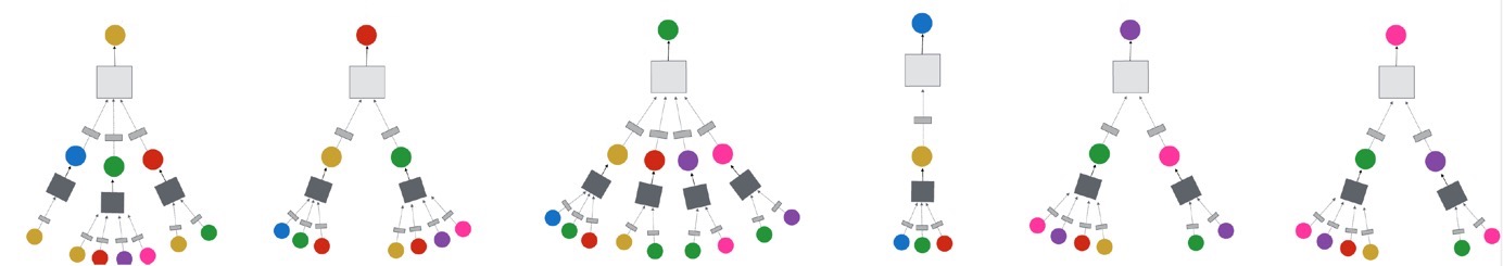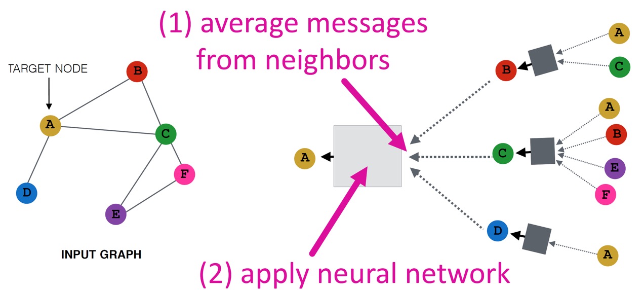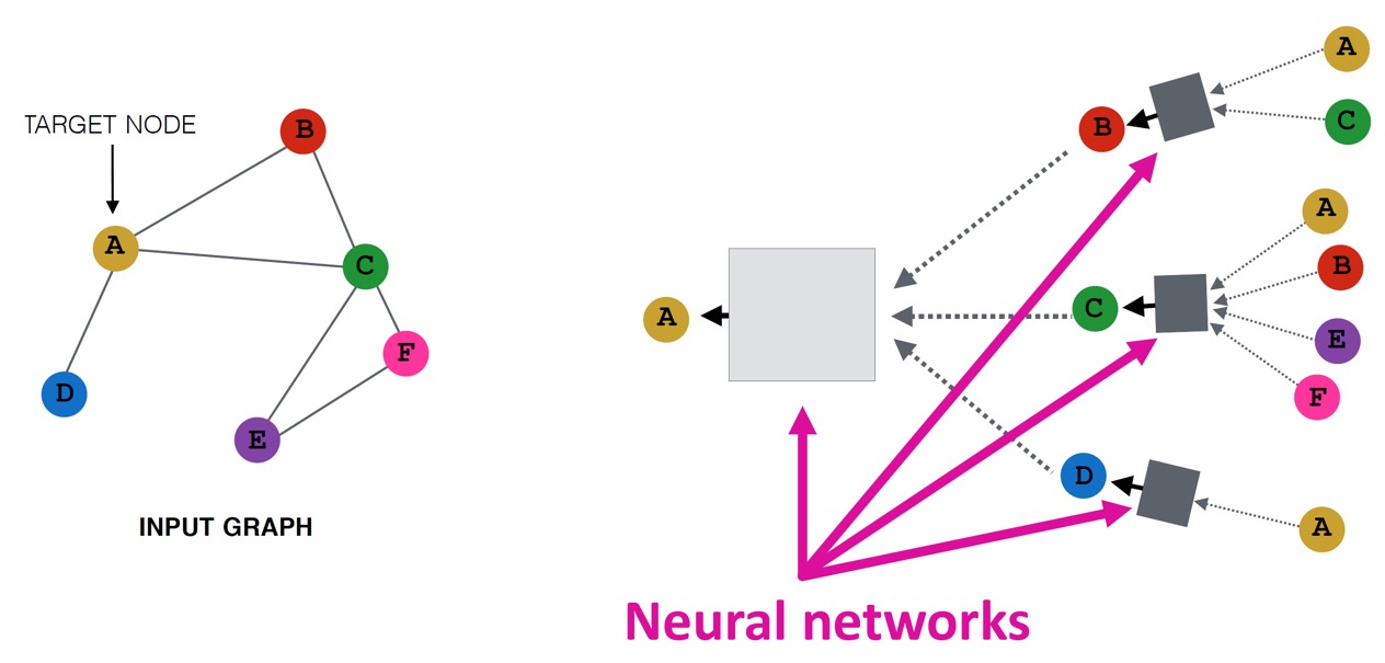 한 가지 주목할 점은, 같은 노드가 여러 번 등장할 수 있다는 것이다. 그림에서는 같은 노드처럼 보이지만, 각각 다른 feature를 갖고 있다. (위 예시에서 처음 입력된 A 노드들은 같은 feature \(\mathbf{x}_A\)를 갖고 있을 것이고, NN을 지나면서 최종 target node의 feature는 완전히 다른 상태가 될 것이다.)