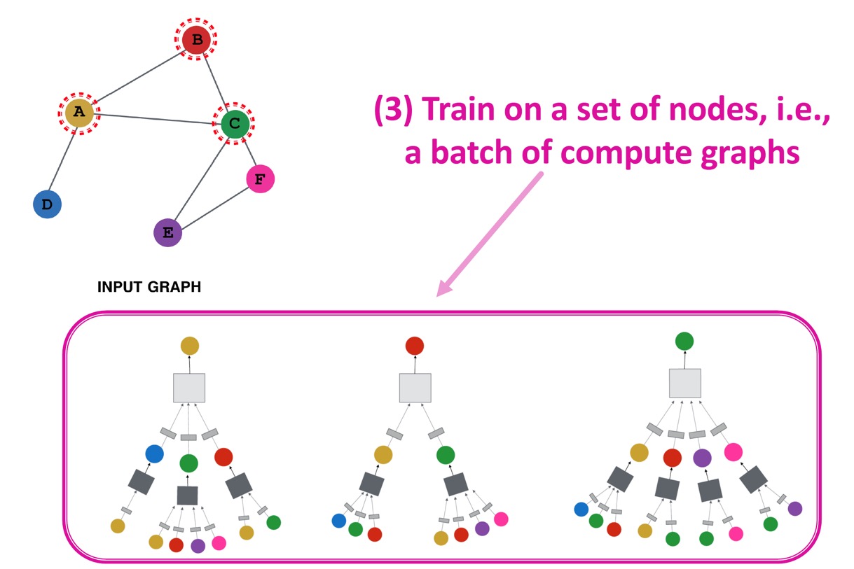 3. Node set(즉, computation graph batch 하나)에 대해 학습을 진행한다. 위 예시에서는 A, B, C node에 대한 computation graph에 대해 학습을 진행했다.