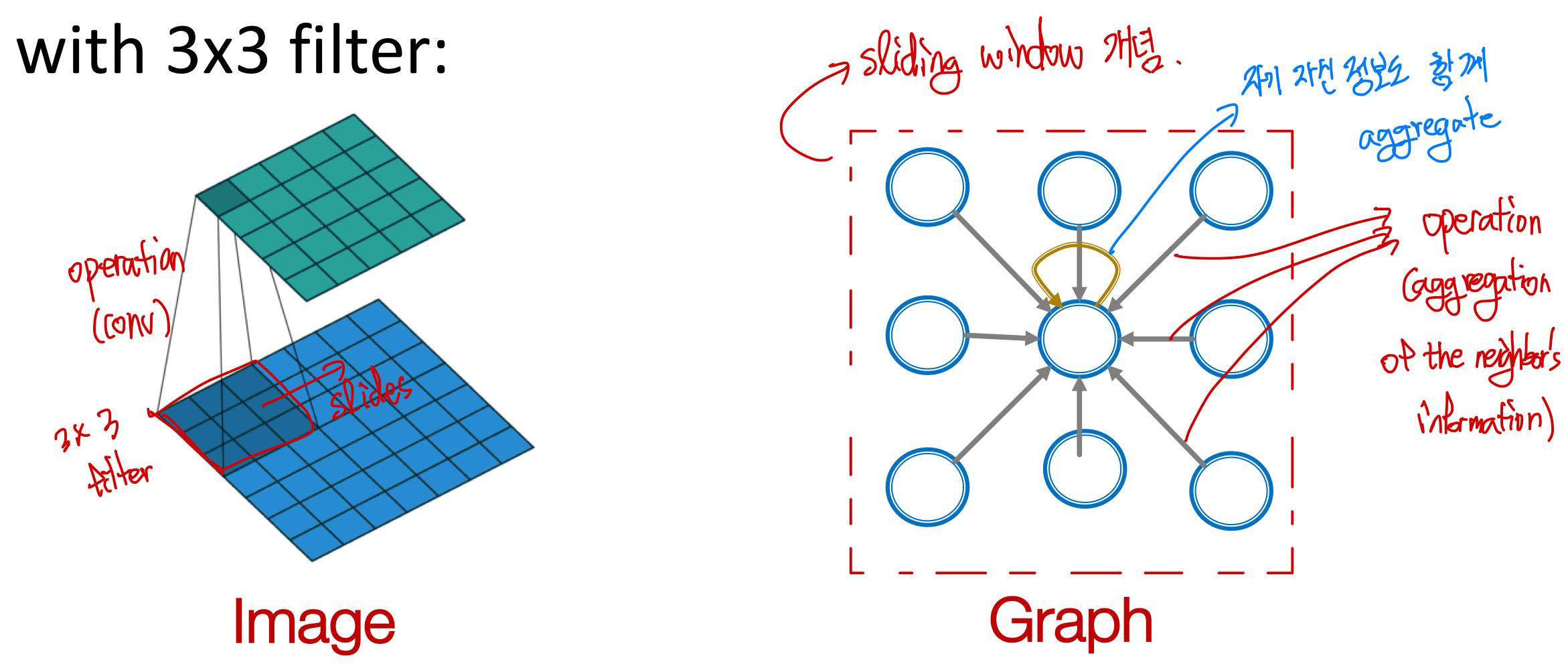 이를 graph에 적용해보면, image pixel 하나를 node로 생각해본다면 node feature/attribute에 convolution 연산을 적용해볼 수 있을 것이다.