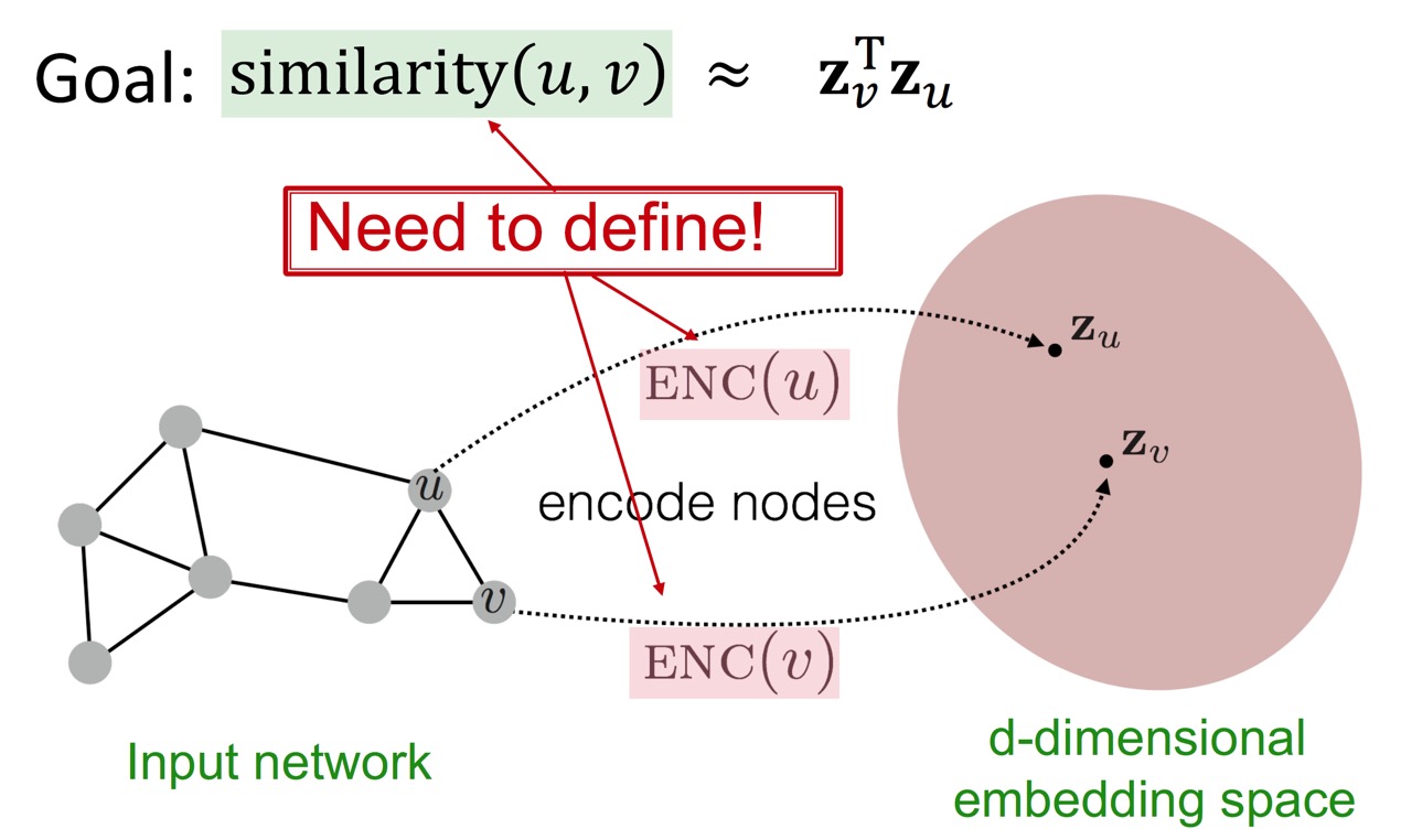 간단히 복기해보자면, encoder는 각 노드를 embedding space로 맵핑해주는 함수이고, similarity function은 embedding space에서의 node embedding \((z_u, z_v)\) 사이의 관계(대표적으로 dot product)를 통해 원래 network의 node \((u, v)\)사이의 관계(similarity)를 알 수 있게 해준다.