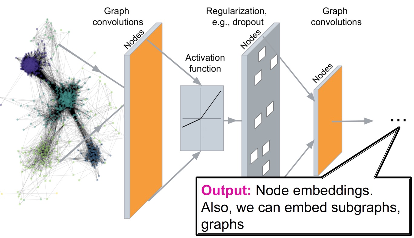 요약하자면, GNN Layer 하나에서는 이전 노드로부터의 message를 얻어와서, 이를 aggregation하는 과정을 거치고, 이러한 layer를 여러 번 쌓아 최종적으로 node embedding을 얻는다.