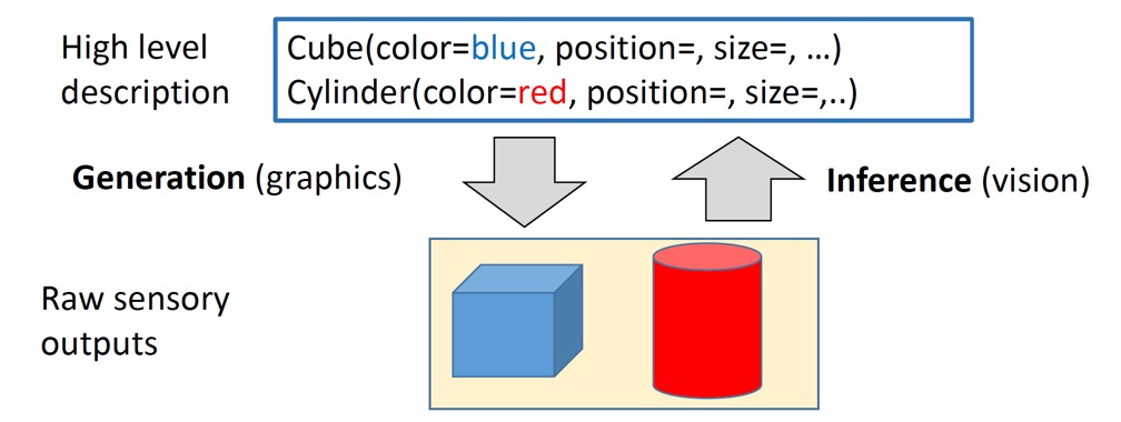 Fig 1에서 볼 수 있듯, high level에서 Cube, Cylinder를 정의해주었을 때 graphic(raw level)으로 생성하는 과정이 generation, graphic을 high level description으로 나타내는 과정이 inference 과정이다.
