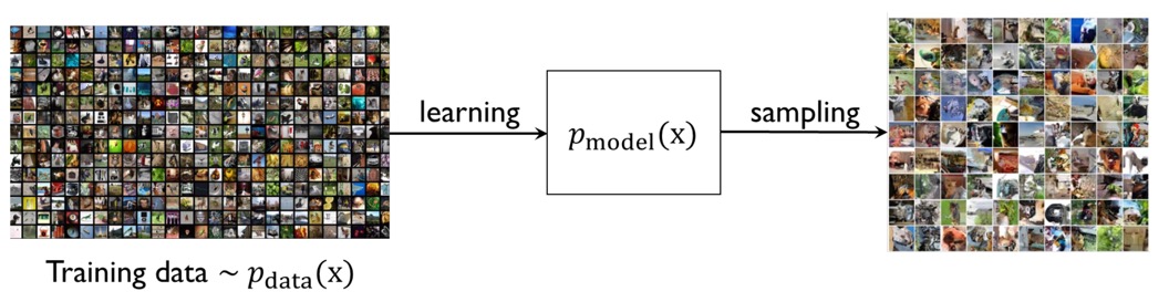 따라서 생성 모델의 목적은 data의 distribution (pdf) \(p_\text{data} (x)\)를 근사하는 \(p_\text{model}(x)\)를 학습하고, \(p_\text{model}(x)\)로부터 새로운 \(x\)를 샘플링하는 것이다.