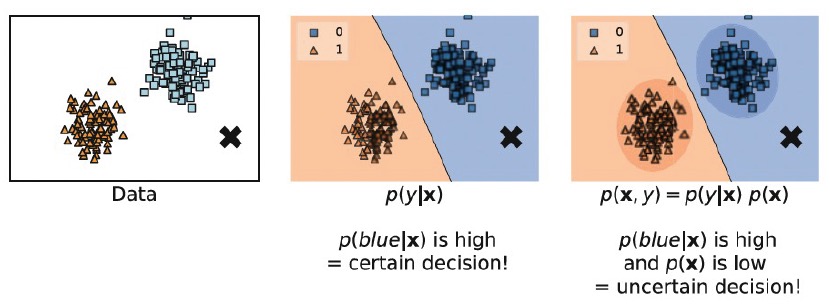 먼저 discriminative model은 decision boundary를 통해 x표시된 지점이 파란 label일 것이라고 확정한다. 하지만, generative model은 x표시된 지점이 blue일 확률이 높지만, 동시에 x의 확률 분포 \(p(x)\)의 값이 낮다는 점도 고려한다. 즉, decision 자체가 확실치 않다(uncertain)는 것을 고려한다는 의미이다.