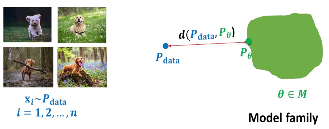 또한 학습(Learning) 과정은 data distribution \(p_\text{data}\)를 근사하는, 즉 Model familty \(M\)에 속하는 parameter \(\theta\) 중에서 \(p_\text{data}\)와 가장 거리가 가까운 \(\theta\)를 찾는 과정인데, 이를 위해서는 probability distribution을 어떻게 비교할지(어떻게 거리가 가까운지 측정(measure)할지)가 중요하다.
