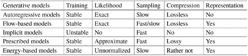Deep generative model들을 분류한 다양한 모델의 특성은 다음과 같이 표로 나타낼 수 있다.