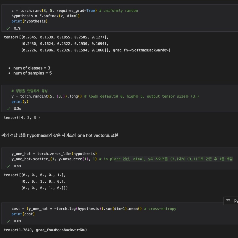 cost = (y_one_hot * -torch.log(hypothesis)).sum(dim=1).mean() # cross-entropy