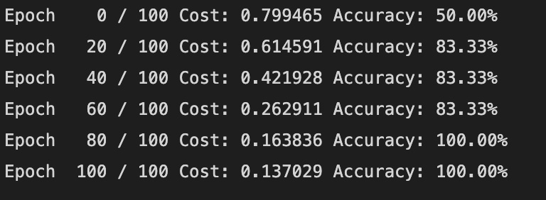 print('Epoch {:4d} / {} Cost: {:.6f} Accuracy: {:2.2f}%'.format(