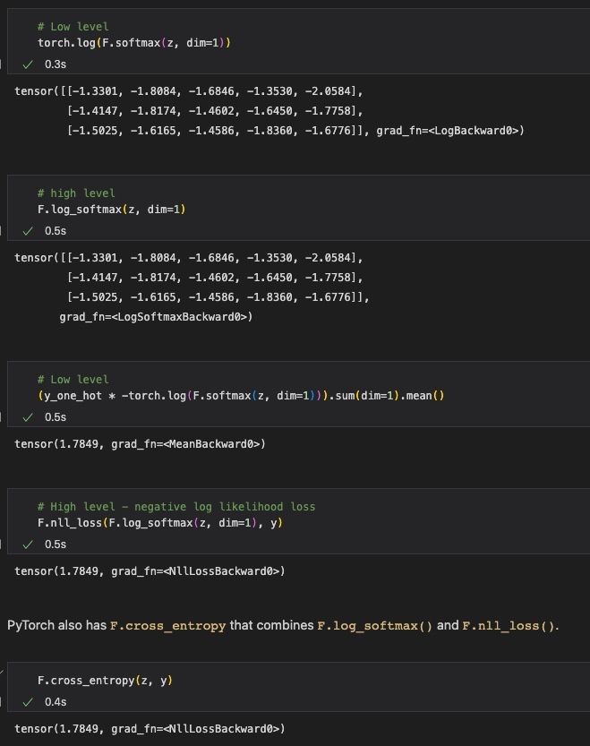 사실 'F.cross_entropy' 함수도 softmax 함수 결과에 로그를 바로 씌워주는 'F.log_softmax()'함수와 Negative Log Likelihood Loss를 계산하는 'F.nll_loss()'함수의 기능을 합한 것으로, 위와 같은 로직을 갖는다.