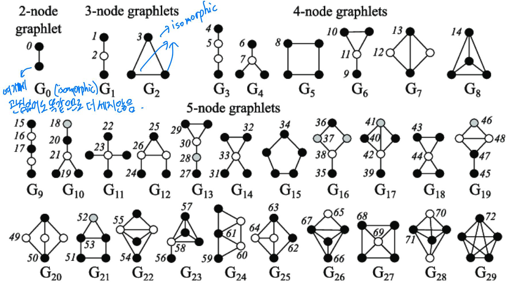 \(G_2\) 예시를 살펴보면, 노드 세 개 중 어디를 기준으로 하던 똑같은 subgraph(isomorphic)를 나타낸다. 따라서 \(G_2\)와 같은 형상의 graph에서 가능한 graphlet은 하나 뿐이다.