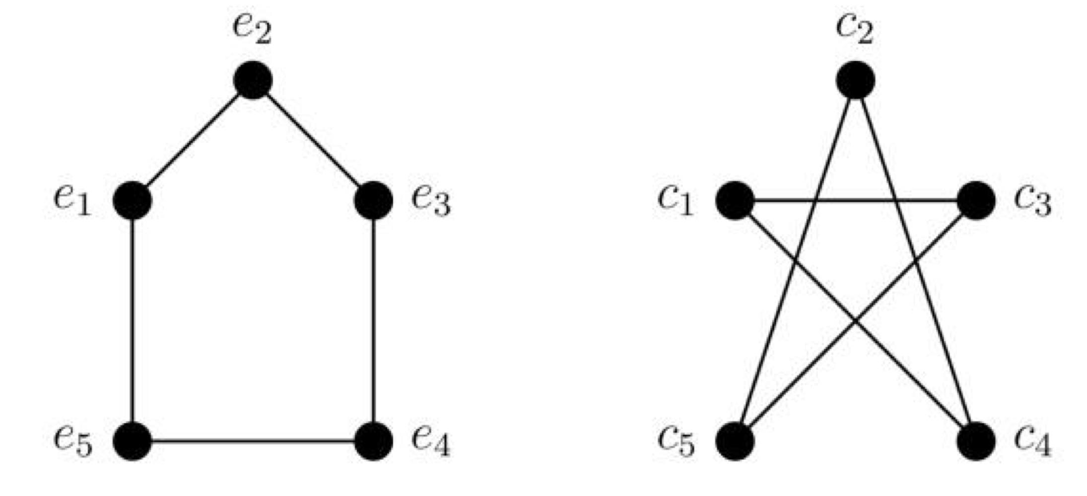 위 두 그래프는 왼쪽 그래프의 node를 \(e_1 \rightarrow c_5, e_2 \rightarrow c_2, e_3 \rightarrow c_4, e_4 \rightarrow c_1, e_5 \rightarrow c_3\)로 mapping하면 완전히 같은 graph임을 알 수 있다. 이 경우 두 그래프가 isomorphic하다고 한다.