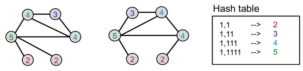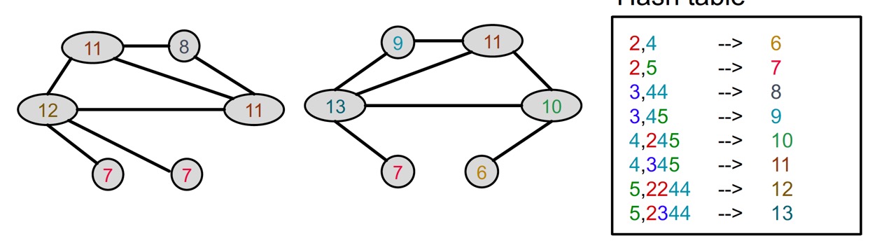 - 어떤 노드 \(v\)의 다음 color는 해당 노드의 이전 color와 이웃 노드의 이전 color들에 대해 HASH 함수를 적용하여 구한다.