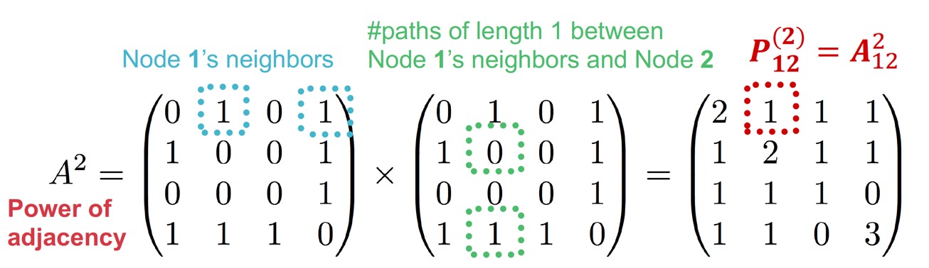 Adjacency matrix \(\mathbf{A}\)에서 두 노드 \(u, v\) 사이에 길이가 2인 path 개수는 \(\mathbf{A}_{uv}^2\)이다.