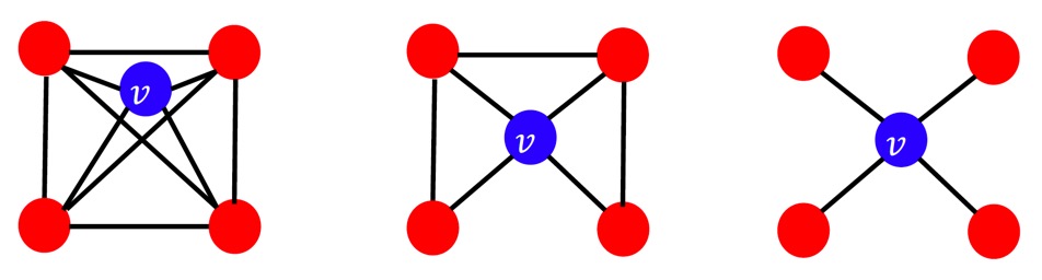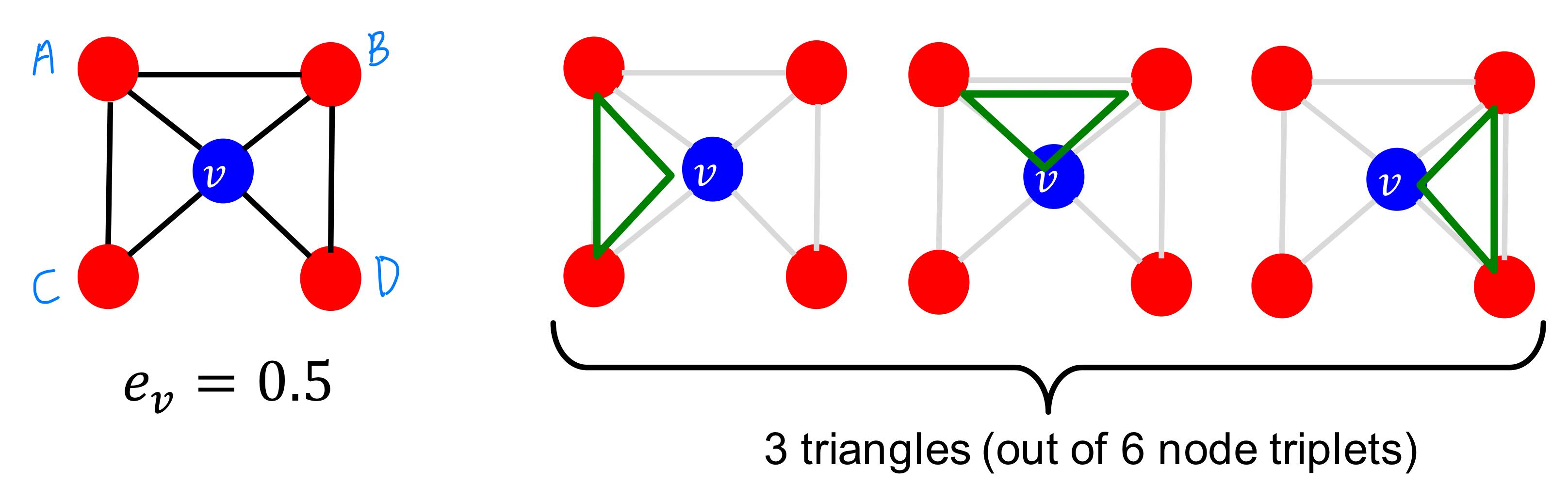 따라서 clustering coefficient \(e_v = 3/6 = 0.5\)이다.