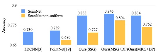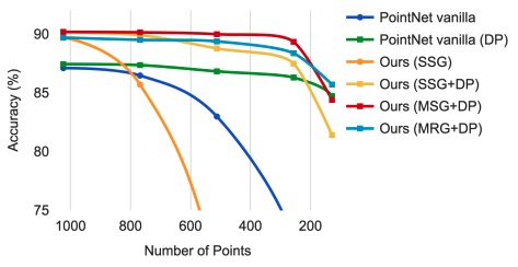 Density adaptive PointNet layer를 사용한 방법(MSG+DP → Multi-Scale Grouping + random input Dropout, MRG+DP → Multi-Resolution Grouping + random input Dropout)이 아주 robust함을 알 수 있다. SSG는 Single Scale Grouping의 줄임말로, adaptive PointNet layer를 사용하지 않은 버전이다.