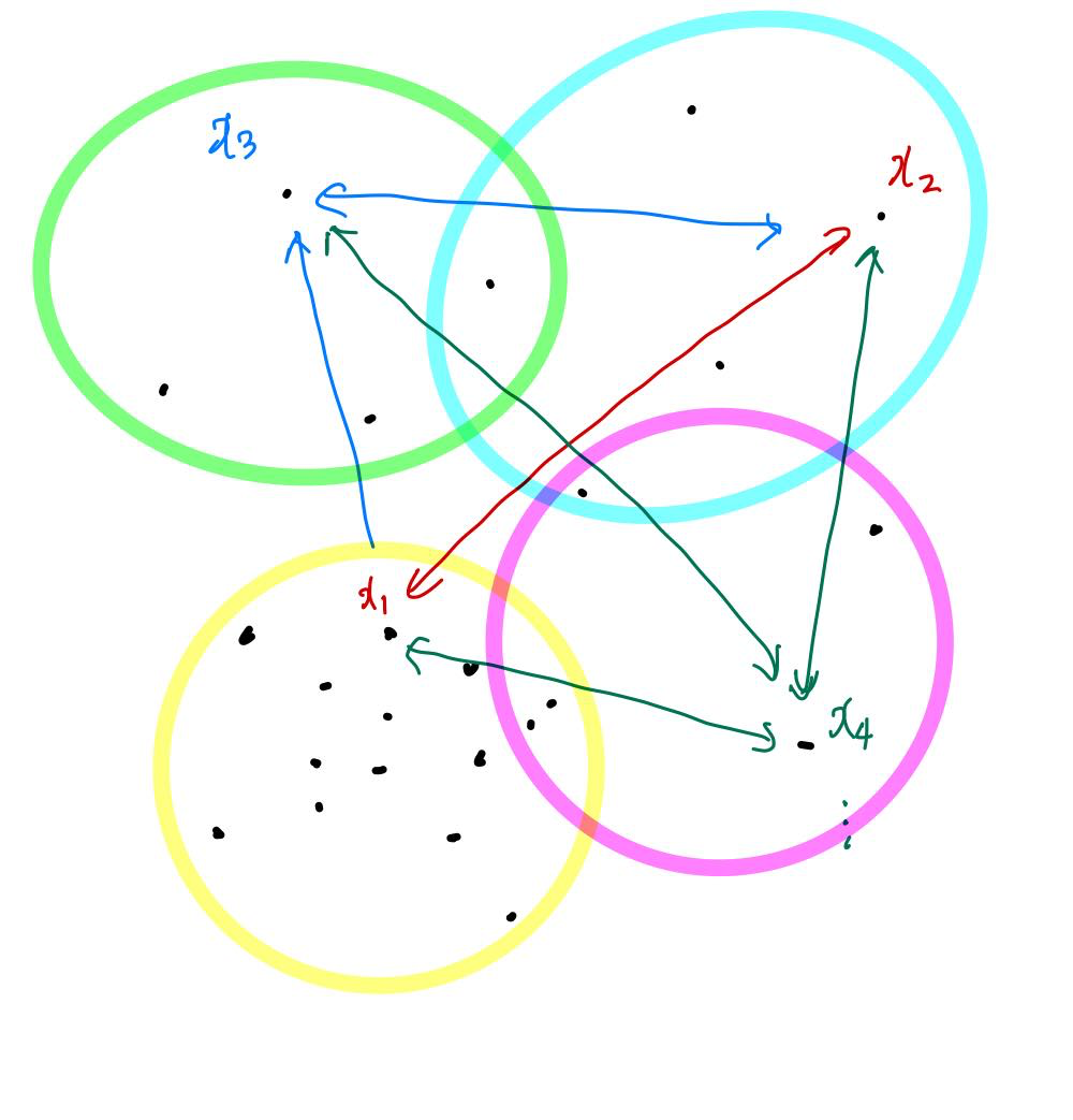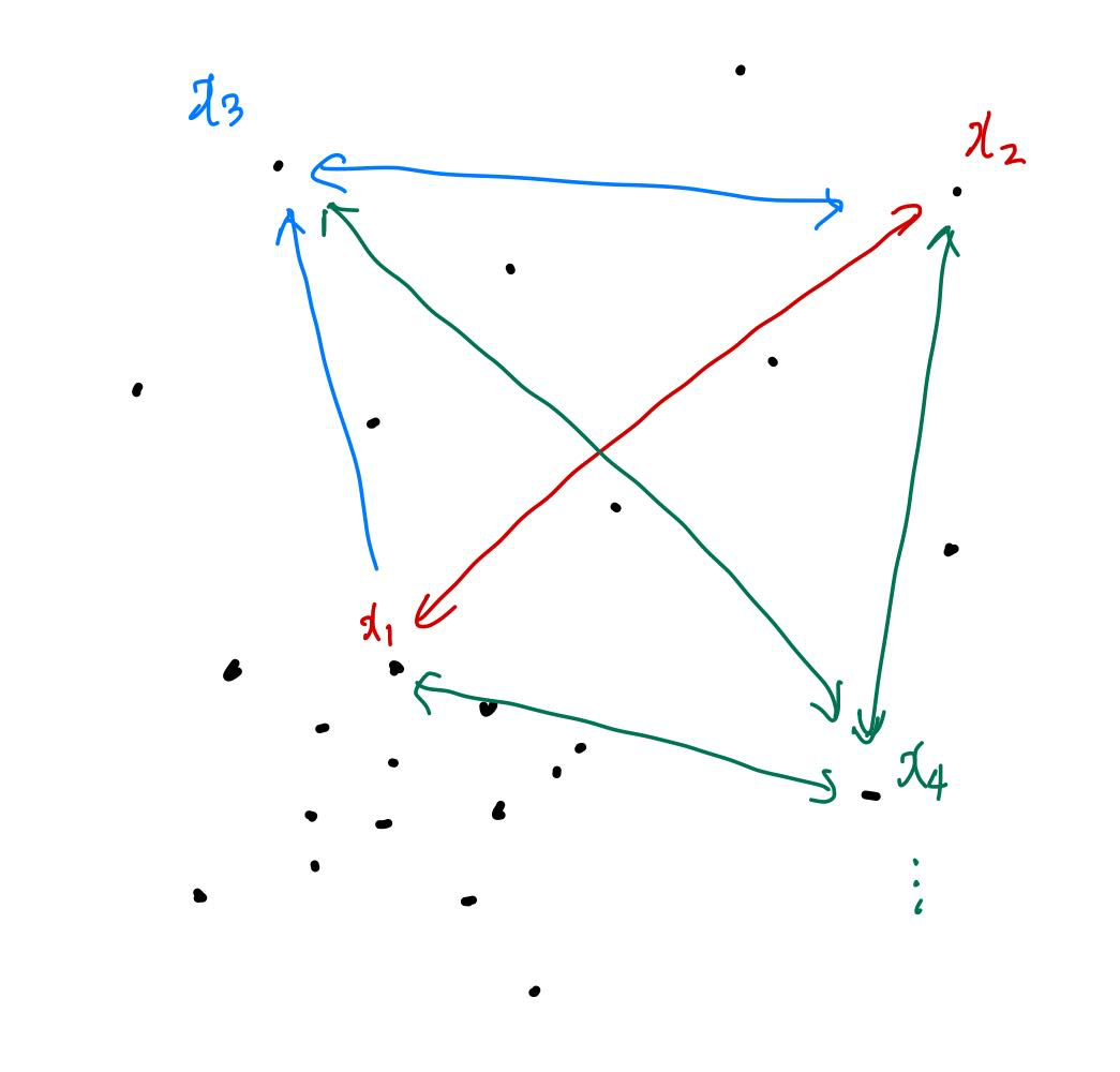 이때 Farthest Point Sampling(FPS) 알고리즘을 사용하여 주어진 input points \(\{x_1, x_2, \dots, x_n\}\)에 대해 subset \(\{x_{i_1}, x_{i_2}, \dots, x_{i_m}\}\)을 고른다. 여기서 \(x_{i_j}\)는 set \(\{x_{i_1}, x_{i_2}, \dots, x_{i_{j-1}}\}\)을 제외하고 남은 점 중에서 모든 set과의 거리가 가장 먼 점을 말한다.