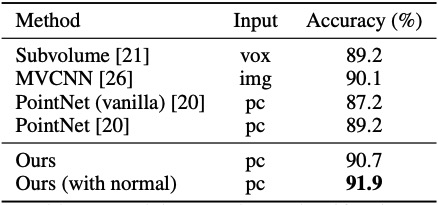 PointNet과 비교했을 때, hierarchical architecture를 적용한 결과 3D object classification 성능이 더 좋아졌음을, CNN 기반 방법인 MVCNN보다 point set 기반 방법이 성능이 더 좋음을 알 수 있다. (마지막 행에서 normal information이란, input point feature로 face normal을 추가한 것이다.)