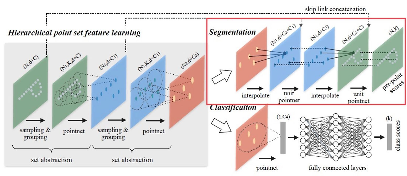 PointNet에서와 마찬가지로, segmentation task를 수행하기 위해서는 모든 point 각각에 대한 segment label score가 필요하다. 따라서 subsampling했던 point feature를 원래의 point로 전파(propagate)하는 과정이 필요하다.