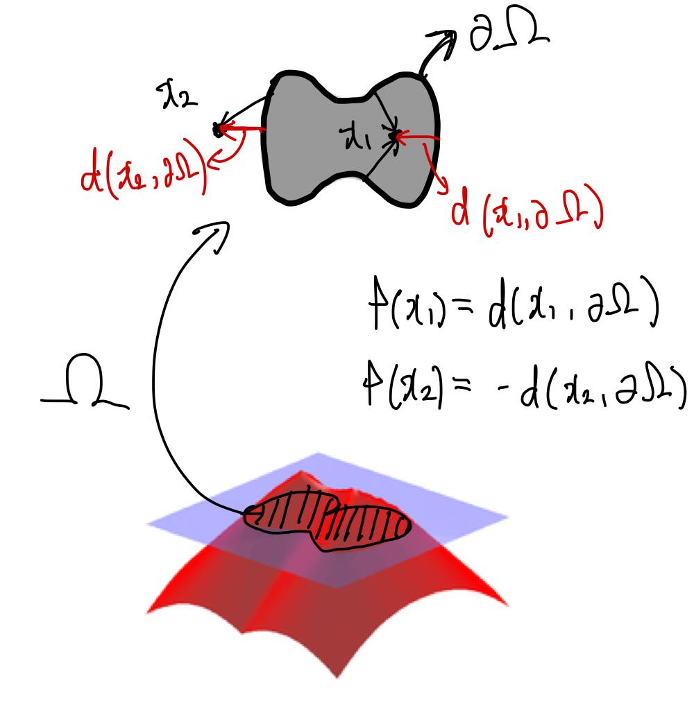 Signed distance function의 수학적인 정의는 metric space에 포함된 set \(\omega\)(어떤 구역)에 대한 주어진 point \(x\)의 (부호가 있는) orthogonal distance이다.