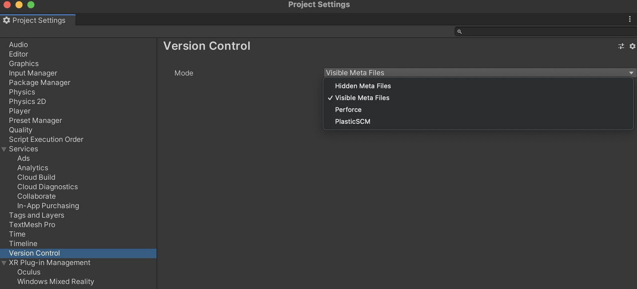 그리고, Edit → Project Settings → Version Control → Version Control Mode를 다음과 같이 'Visible Meta Files'로 통일하여 설정해준다.