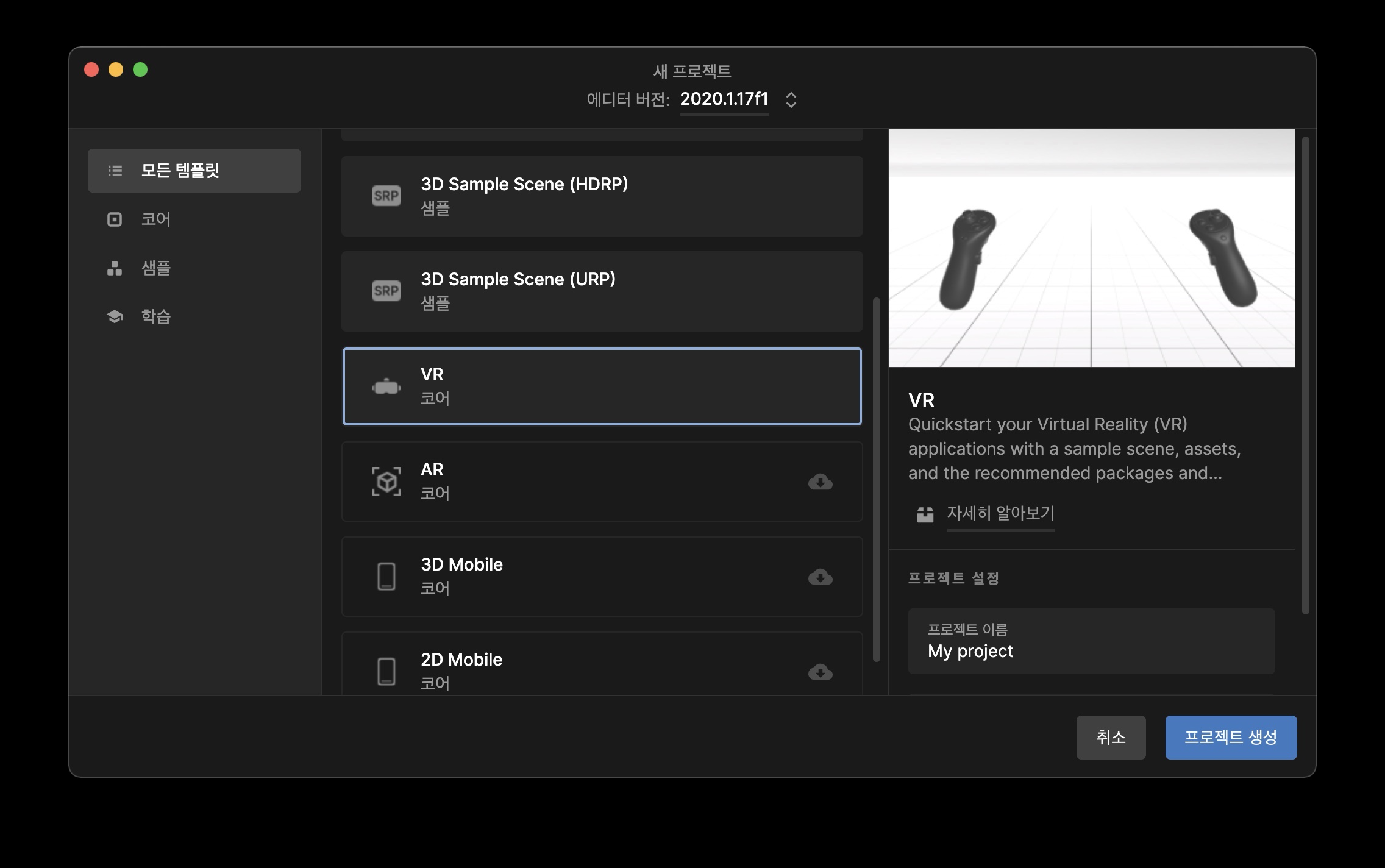 Unity hub에서 새 프로젝트 - VR 템플릿을 이용하여 프로젝트를 생성하였다.