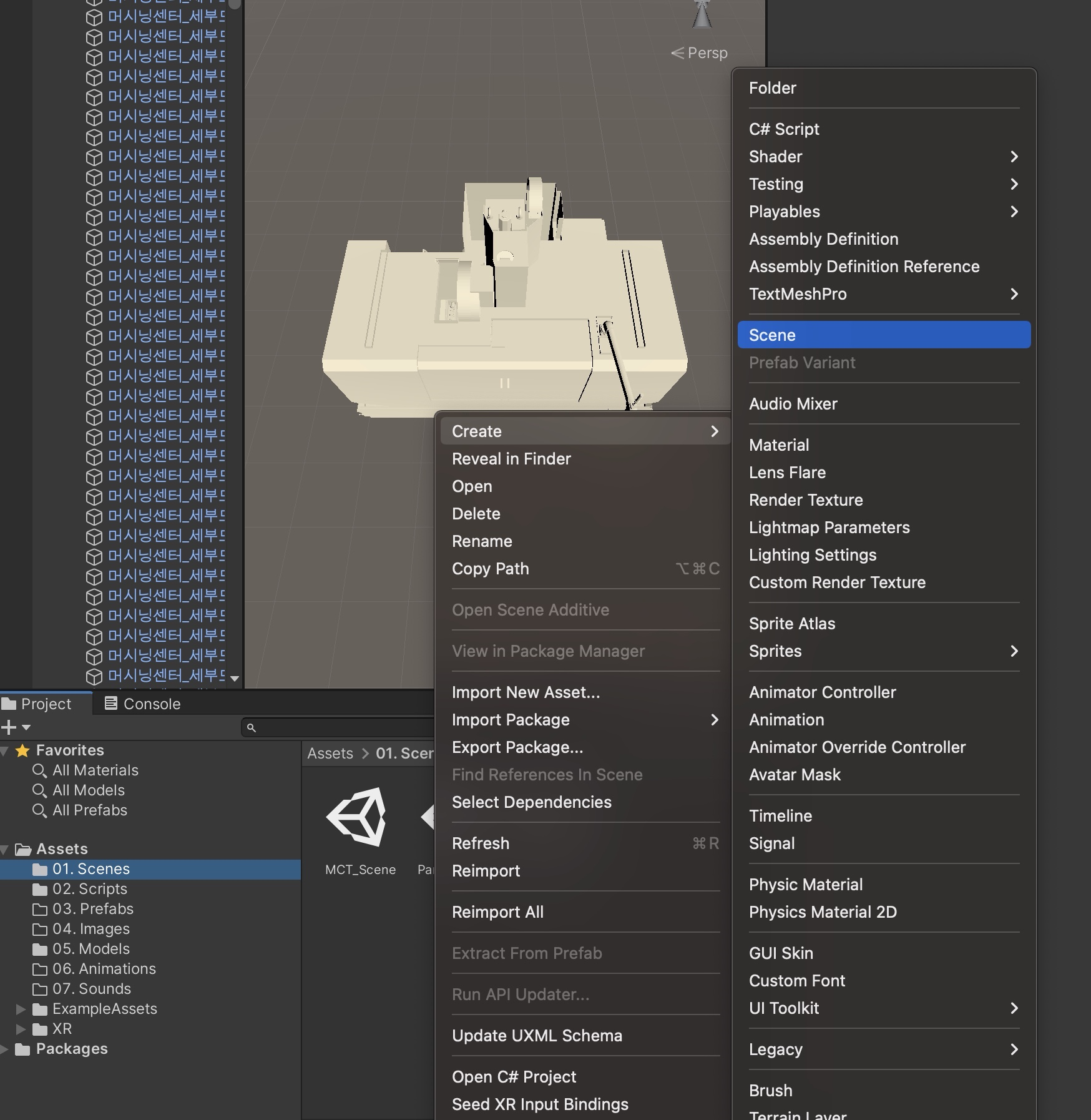 '01. Scenes' 폴더를 클릭하고, 빈 부분을 우클릭한 후에 Create → Scene을 선택한다.