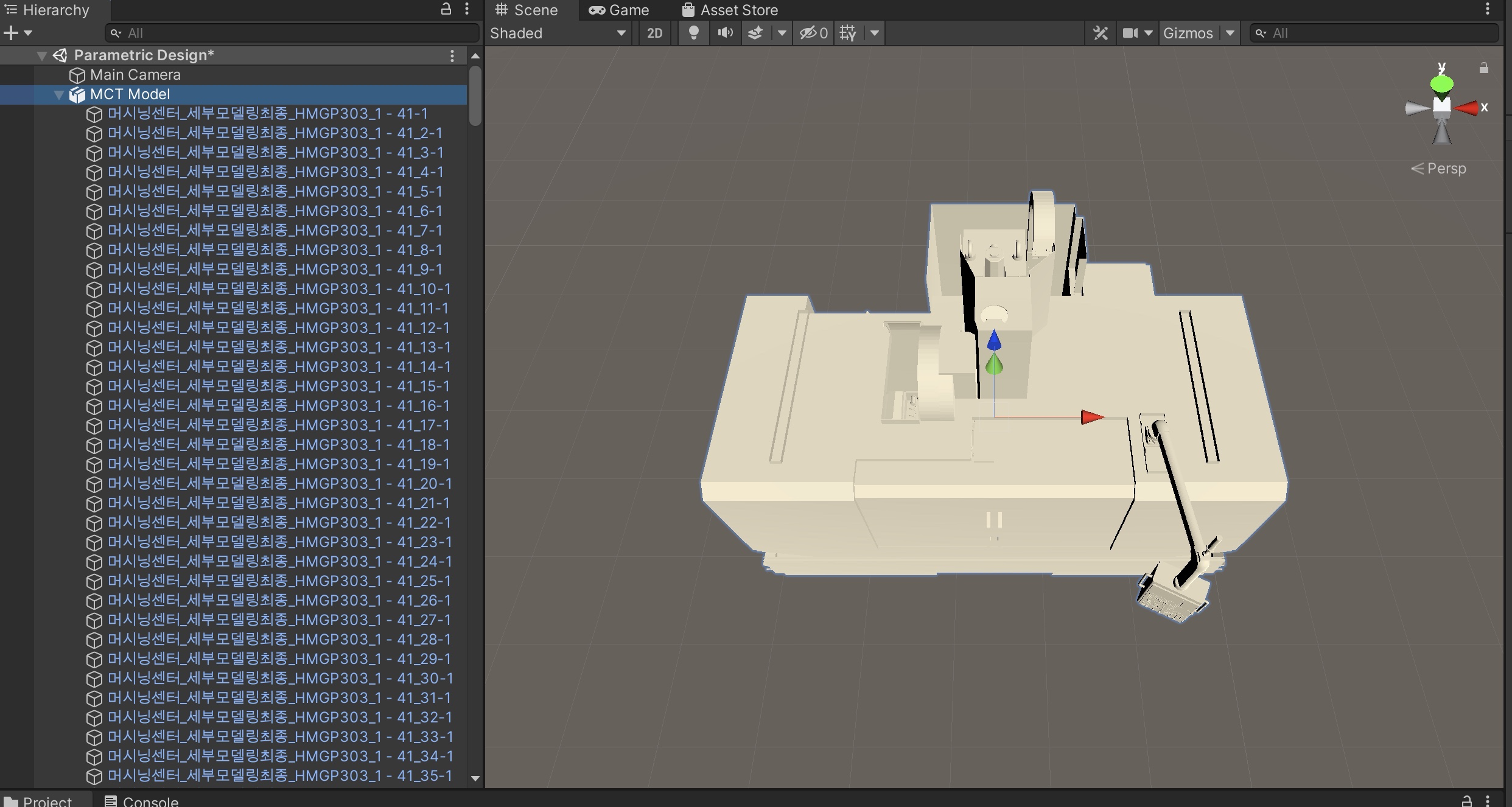 fbx파일로 변환하면 위와 같이 세부 부품들이 3D CAD에서와 달리 모든 세부부품들이 나열되어있는 형태로 나오는데, 이를 사용자가 3D CAD file에서와 같이 hierarchy를 지정해주어야 한다.