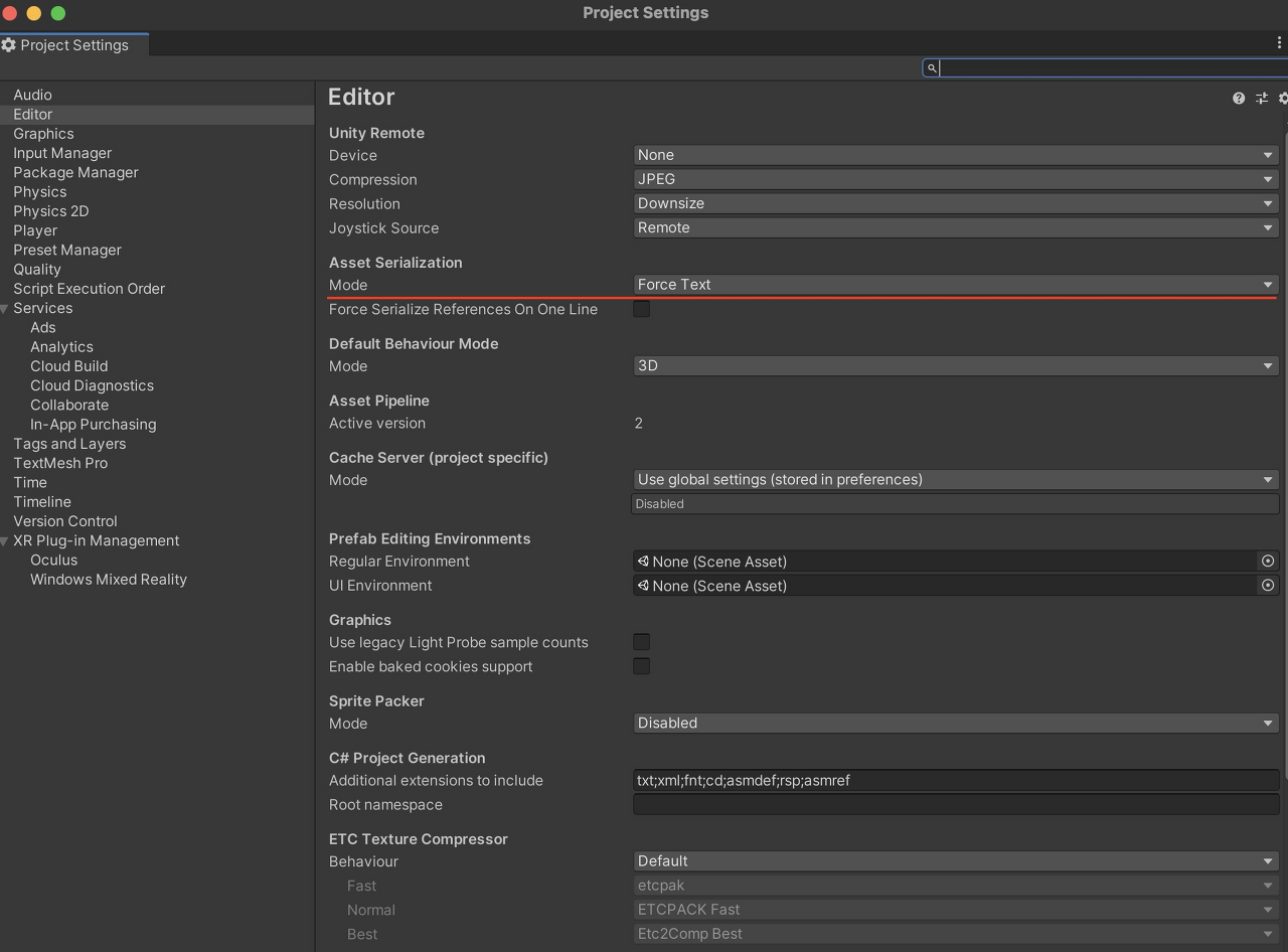 먼저, 유니티 창 상단 메뉴바에서 Edit → Project Settings → Editor → Asset Serialization Mode를 Force Text로 설정해주어야 한다.
