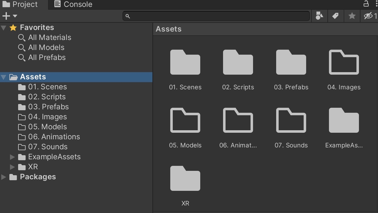Assets 하위 폴더들 각각을 간단히 설명하자면 다음과 같다. 프로젝트 생성 시 default로 존재하는 폴더들은 정렬을 위해 번호만 붙여준다.