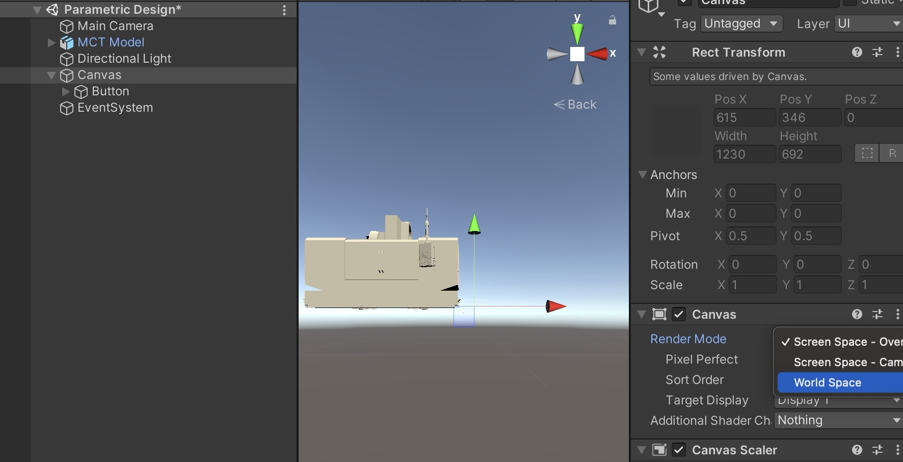 Canvas를 클릭하여 우측의 Inspector에서 'Canvas - Render Mode'를 'World Space'로 설정한다.