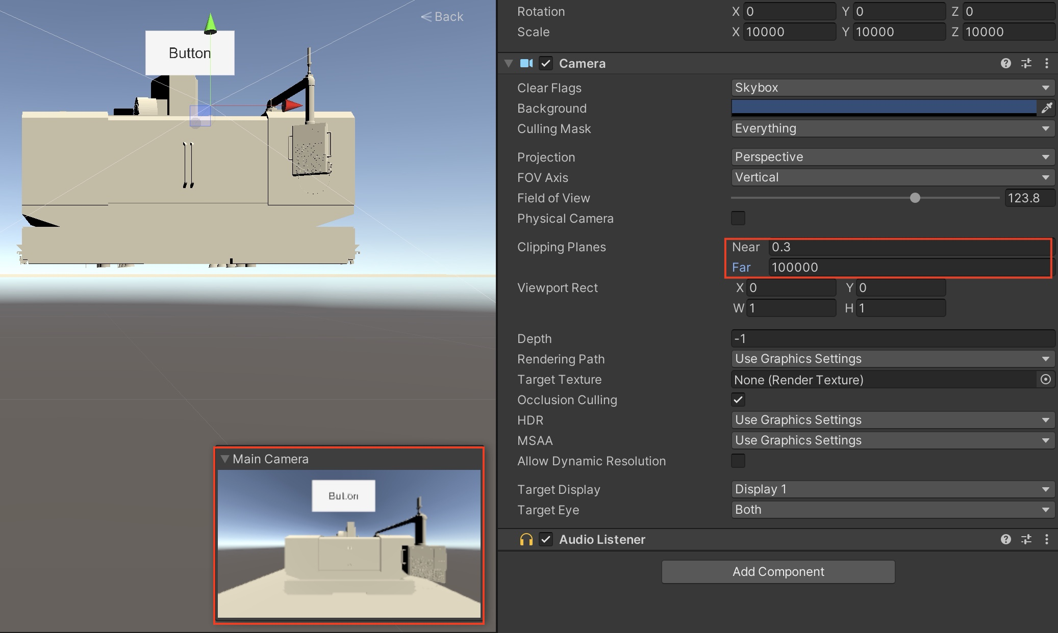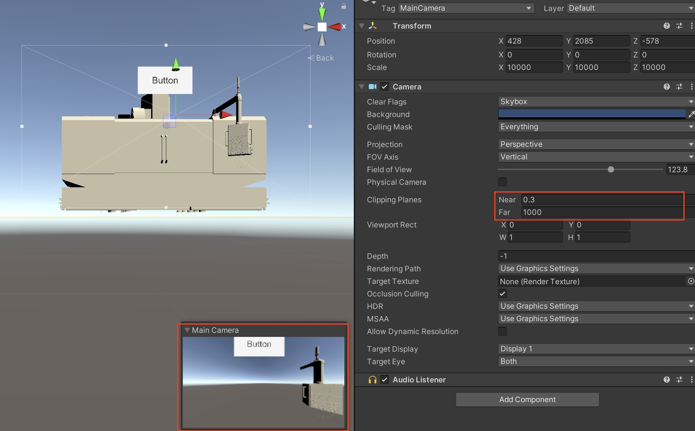 모델을 mm단위로 변환하여서 Object의 크기가 매우 크므로, 기본 main camera의 세팅을 조금 변경해 주어야 한다.