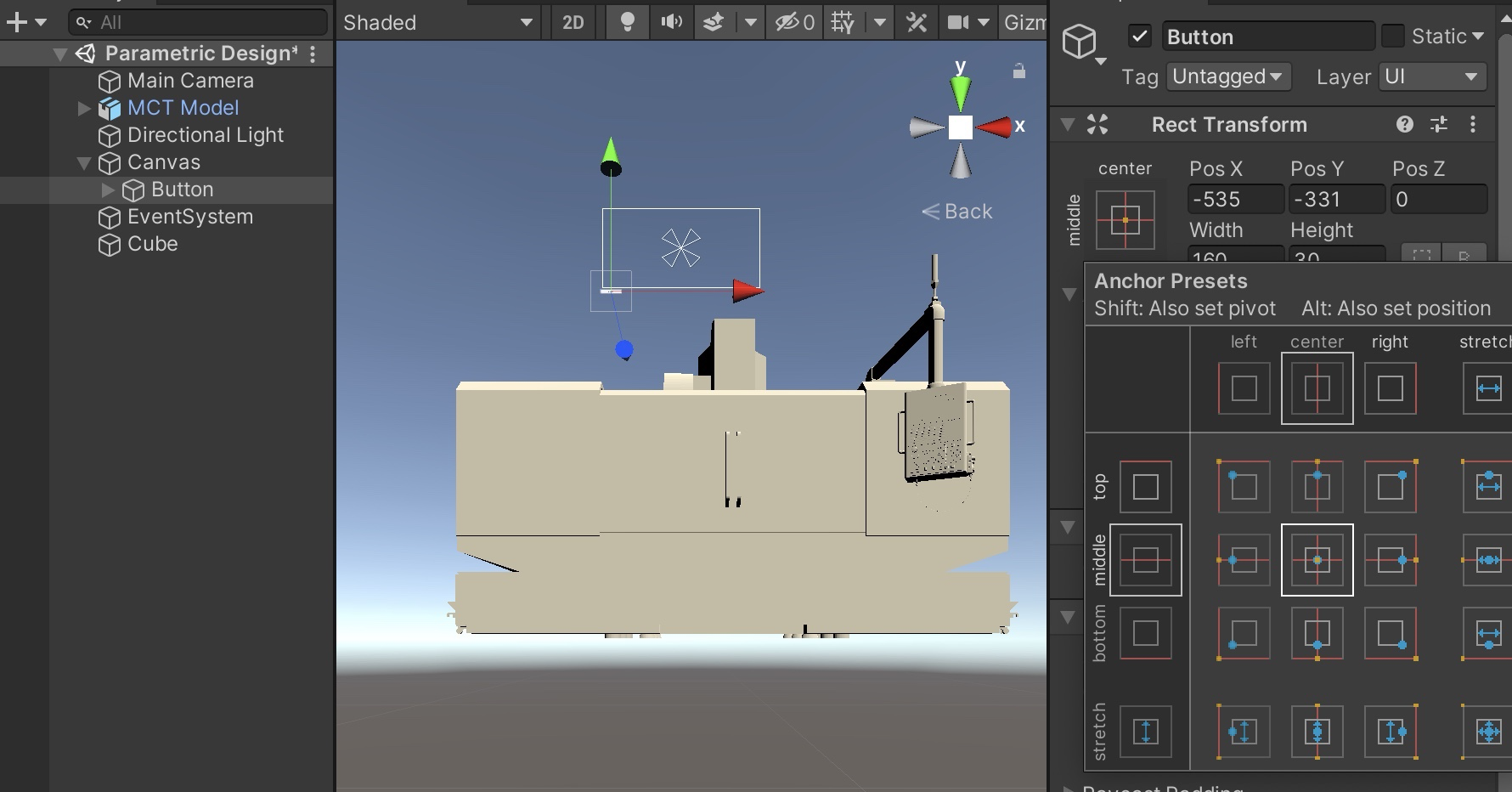 그리고 Button의 Inspector에서 'Rect Transform'의 아래 사진과 같은 부분을 클릭해보자.