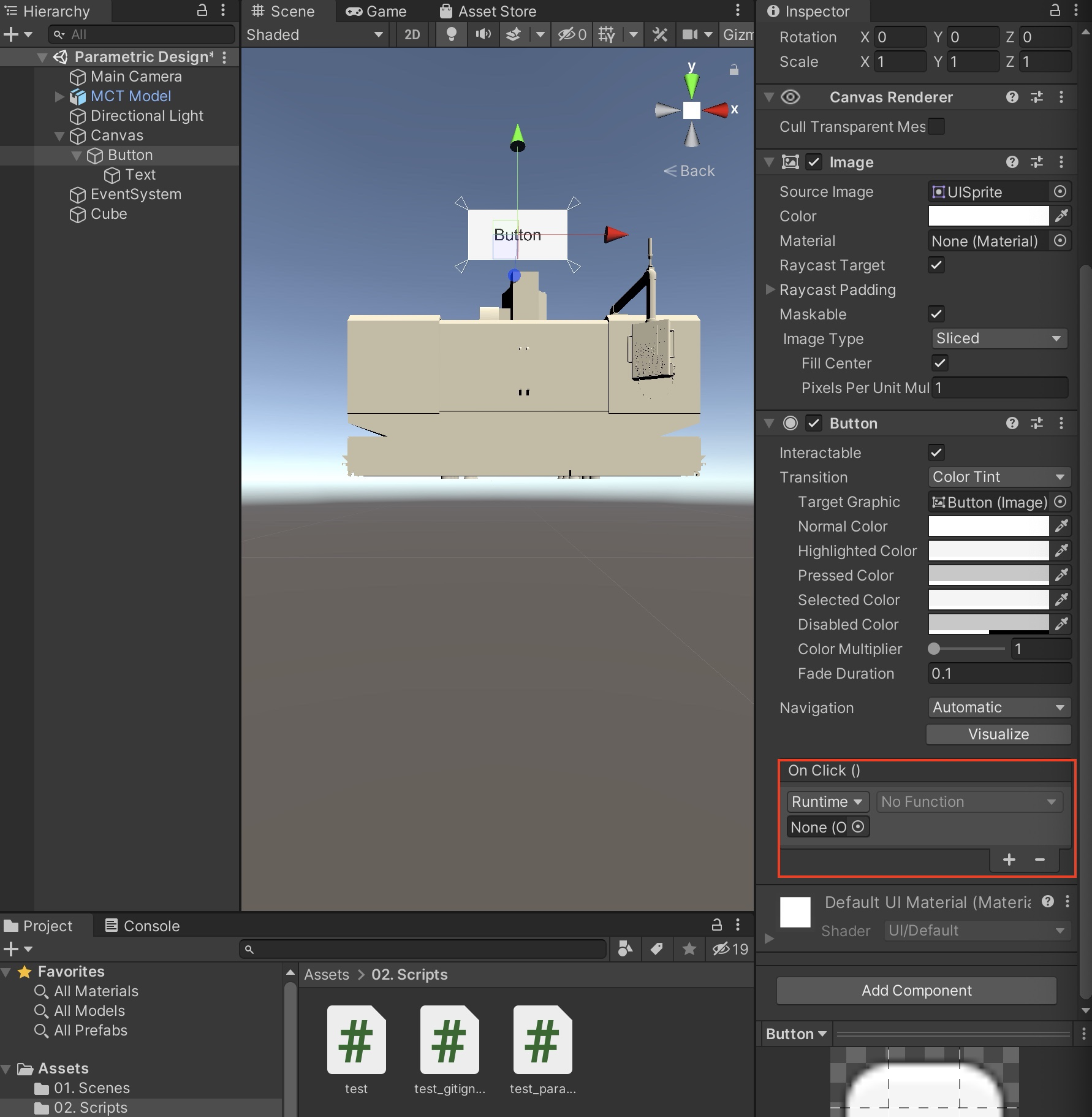 이제 버튼을 눌렀을 때, C# Script가 실행되도록 설정해보자.