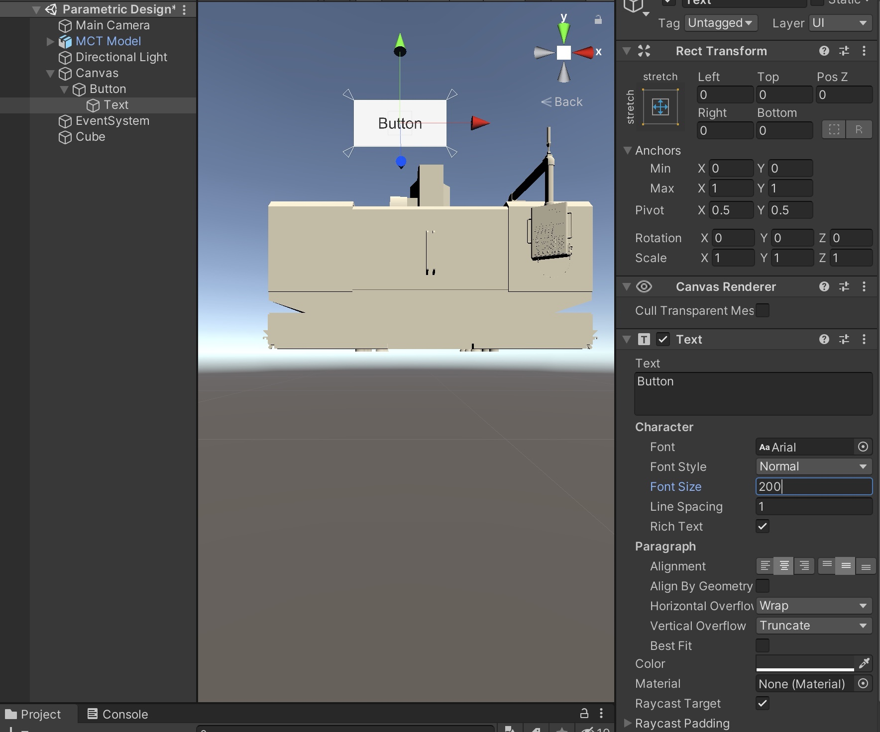 그리고 Button 하위의 Text Object에서 문자의 크기를 적절하게 키우면 버튼 생성이 완료된다.