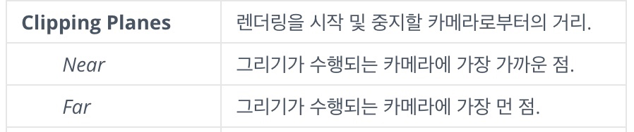 기본적인 속성을 그대로 사용하면 오브젝트가 깨져서 보이는 경우가 있는데, 이때 Near과 Far의 설정을 적절히 변경해주면 깨짐 현상이 대부분 사라진다.