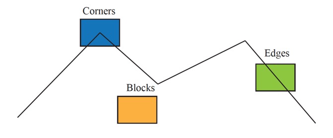 상대적으로 두 이미지에서 같은 corner point들은 똑같이 보일 것이고, 같은 edge는 조금 다르게, 같은 block의 경우에는 많이 다르게 보일 것이다.
