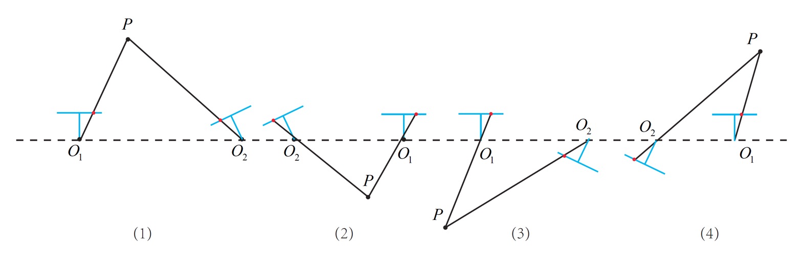 기하학적으로 보면, \(O_1, O_2, P\)는 coplanar(같은 평면 위의 점)이다.